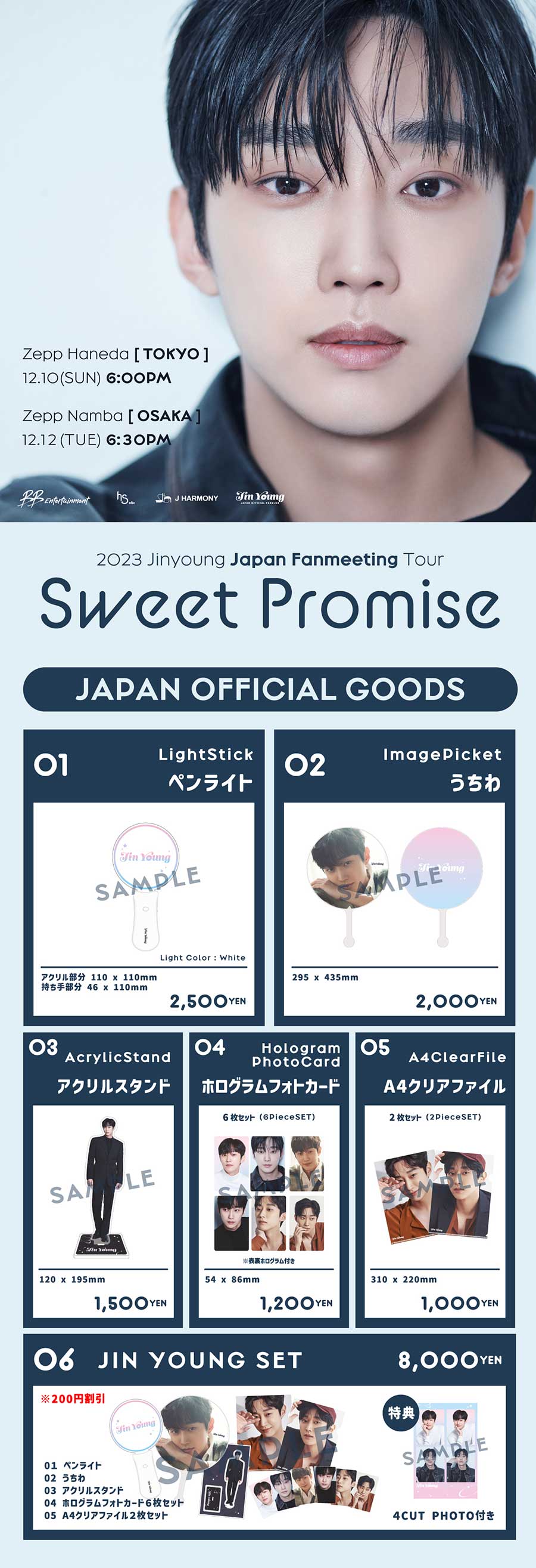 こんにちは。 ジニョン ジャパン オフィシャル ファンクラブ事務局です。 昨年、東京・大阪開催にてされた「2023 Jinyoung Japan Fanmeeting Tour〈SWEET PROMISE〉」でのグッズ販売でございますが、皆さまの熱いご要望にお応えして、 期間限定、数量限定で受注販売にて販売決定となりましたので、お知らせいたします! グッズが買えなくて残念だった皆さまに少しでもお届けできるよう、また二度とめぐり来ない〈SWEET PROMISE〉ファンミーティングを記念いたしまして販売することにいたしました。 お一人様の販売数量が限定されるものもありますが、ご理解いただきご購入ください。 ※予定販売期間数がなくなり次第終了となります。注意事項をよくお読みいただきご注文ください。 【グッズ一覧】全5種類(別途送料必要) ※商品+送料(離島・一部地域は追加送料がかかります) [個別商品]